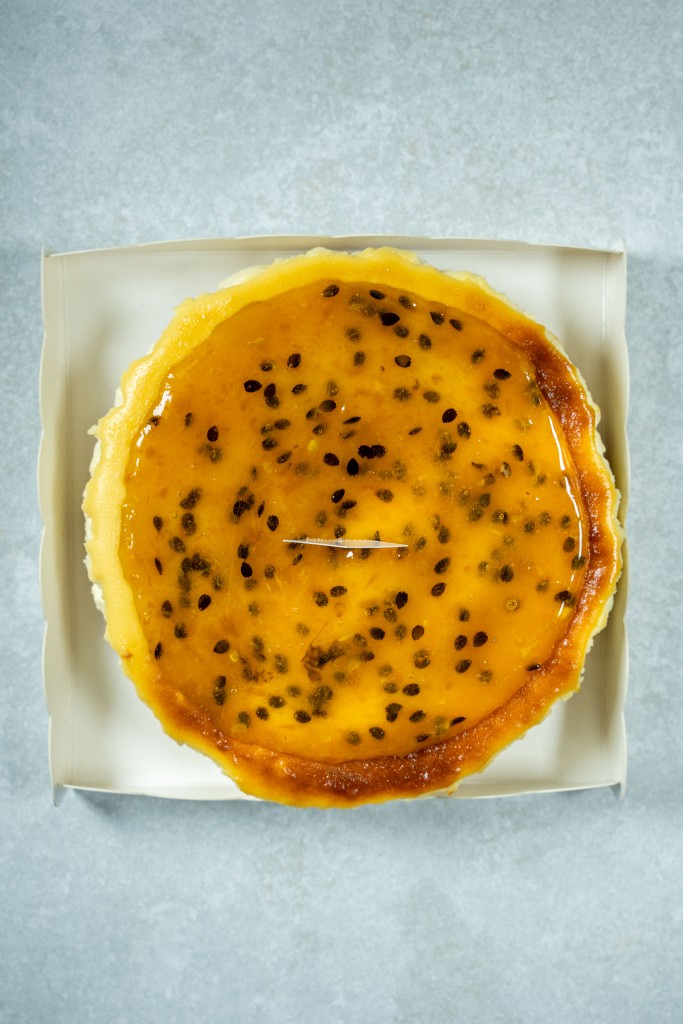 Nuestra cheesecake de maracuyá combina la suavidad de la crema de queso con el toque refrescante de la mermelada de maracuyá.