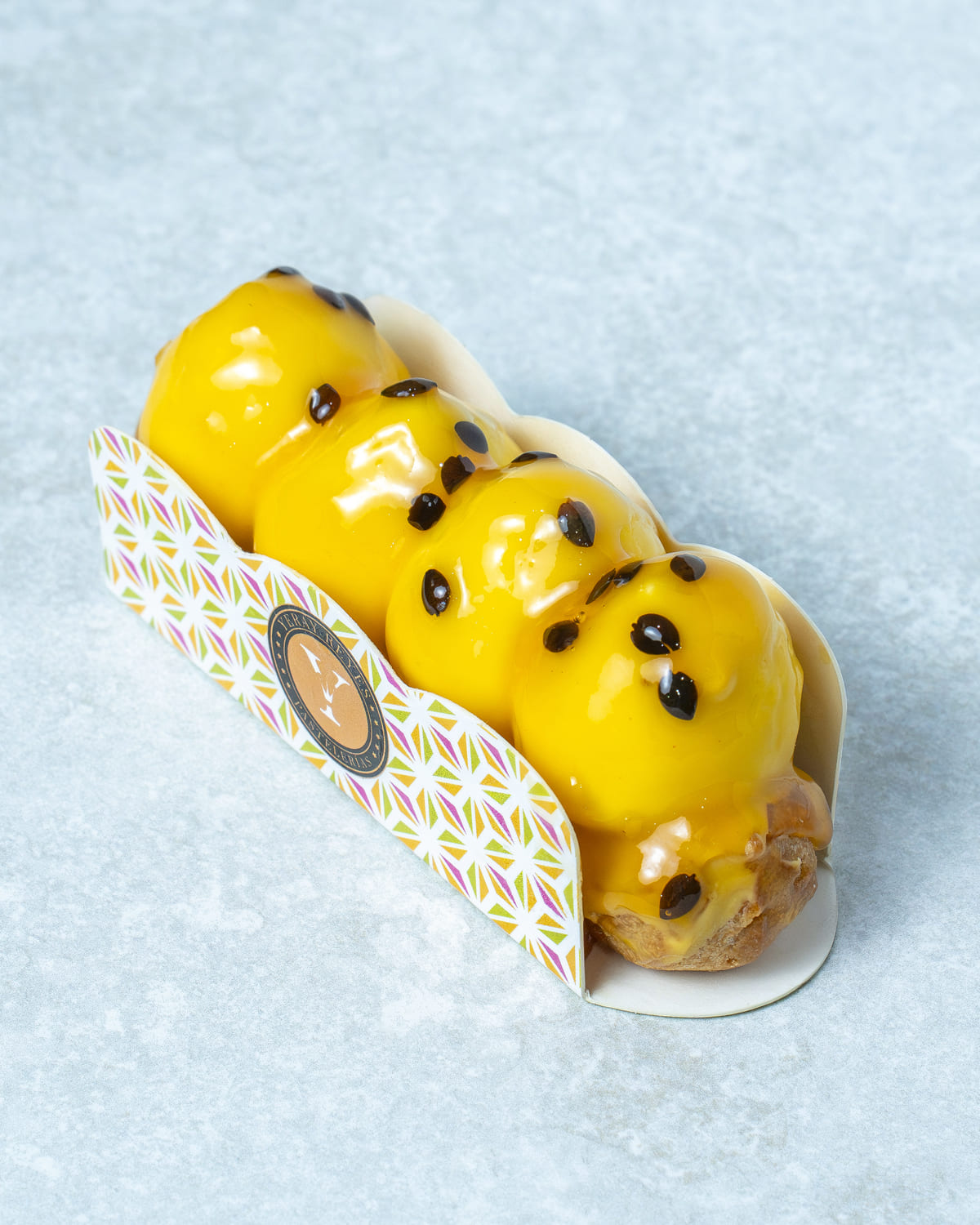 Eclair de maracuyá relleno de namelaka de yogur y compota de maracuyá, coronado con una ganache montada en vainilla que aporta cremosidad y frescura.