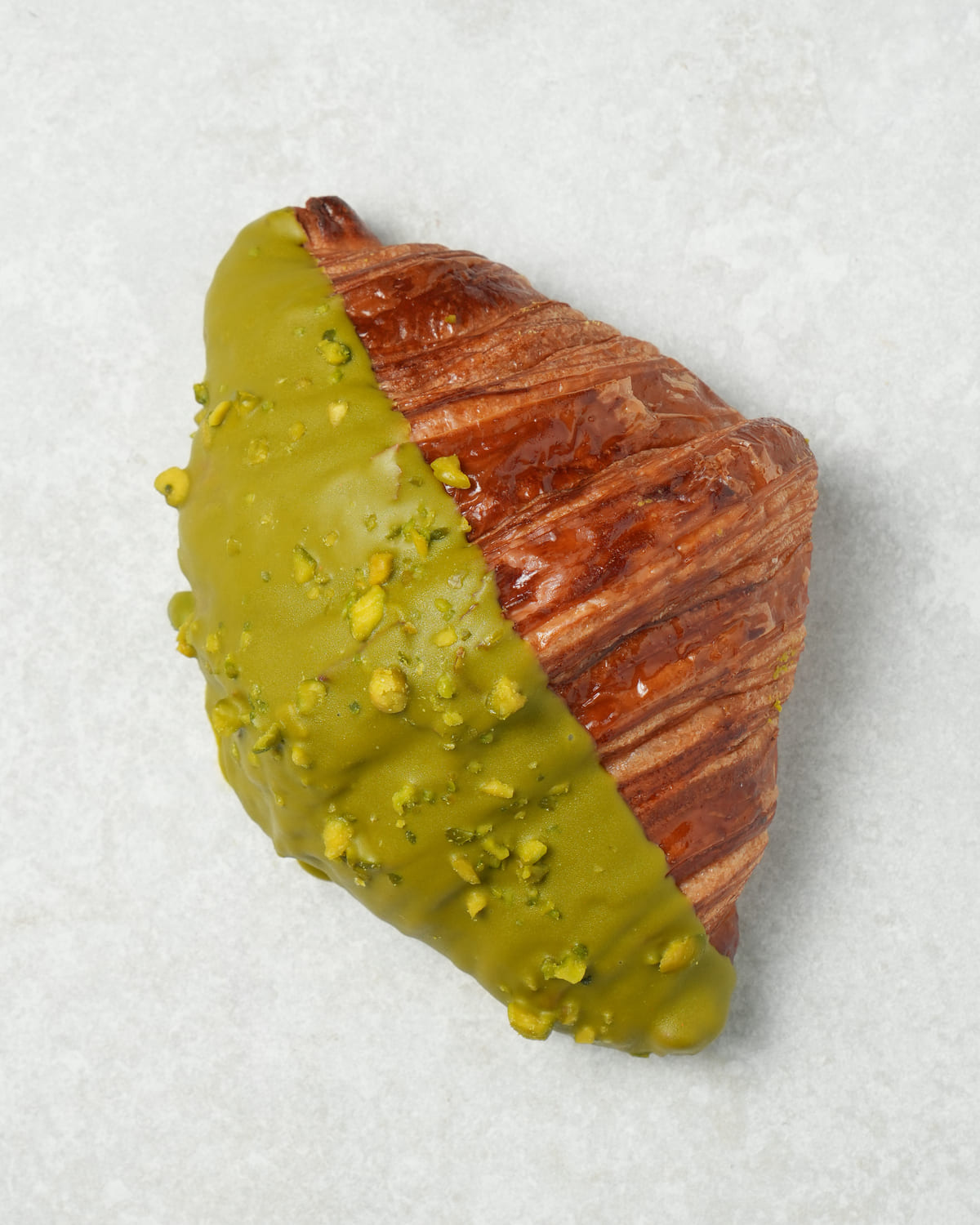 Nuestro croissant de pistacho relleno de namelaka de pistacho y cubierto con chocolate crujiente de pistacho.