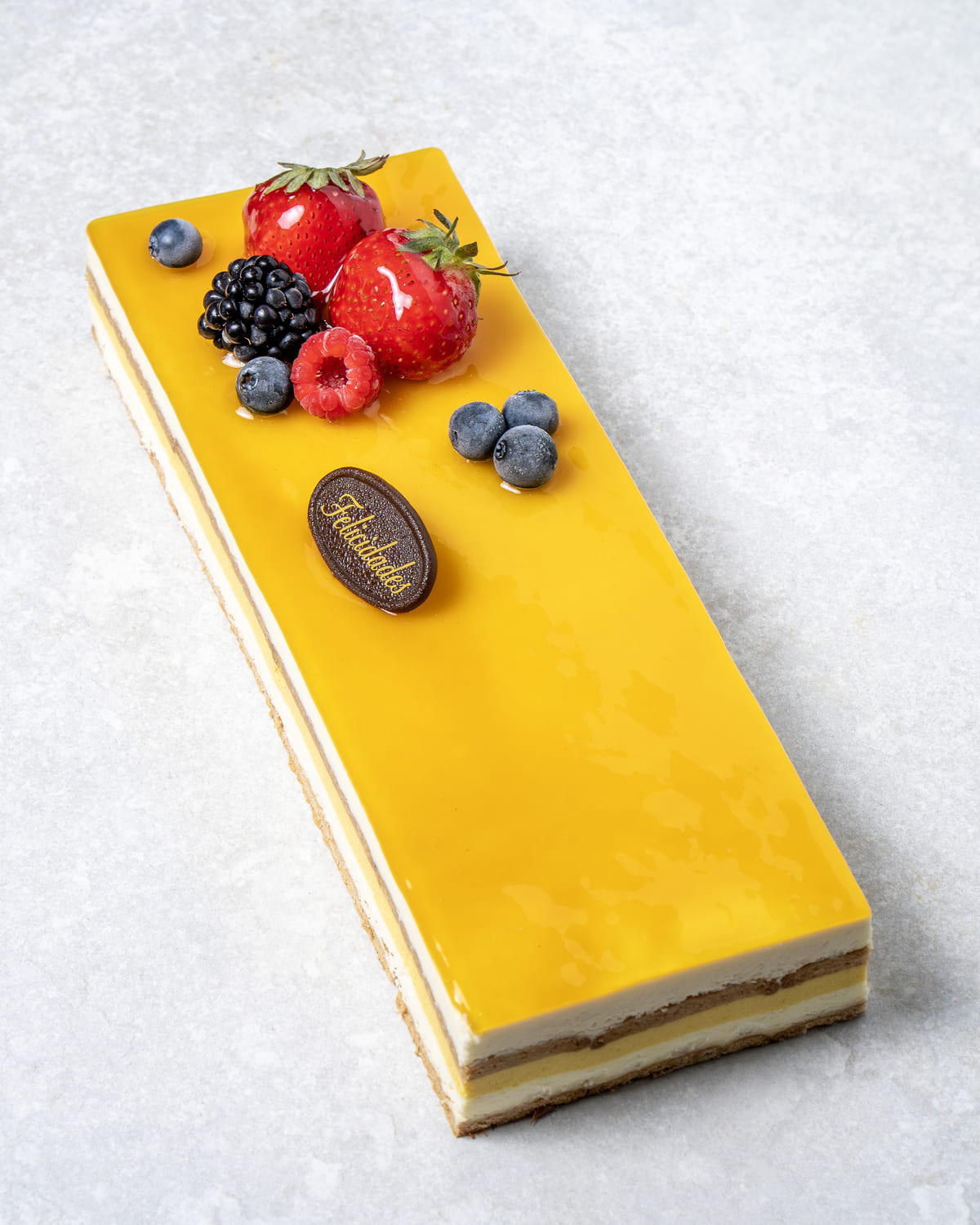Mousse de chocolate blanco con cremoso de mango y galleta.