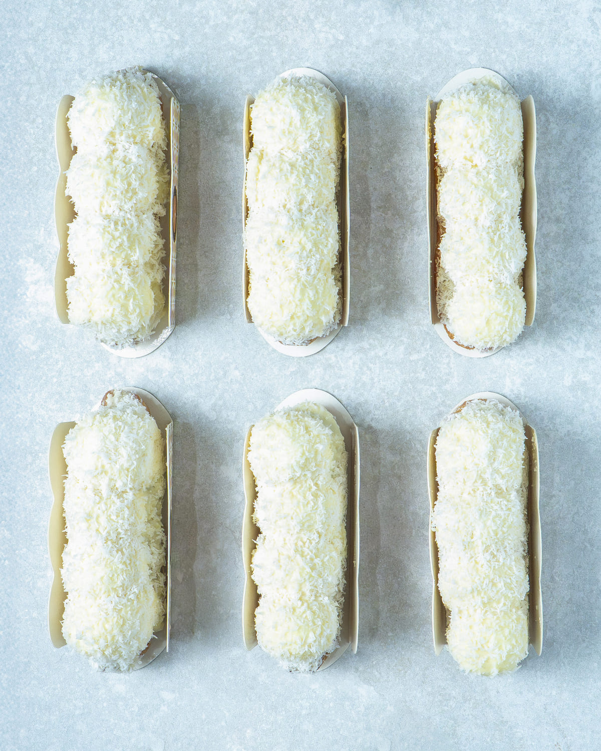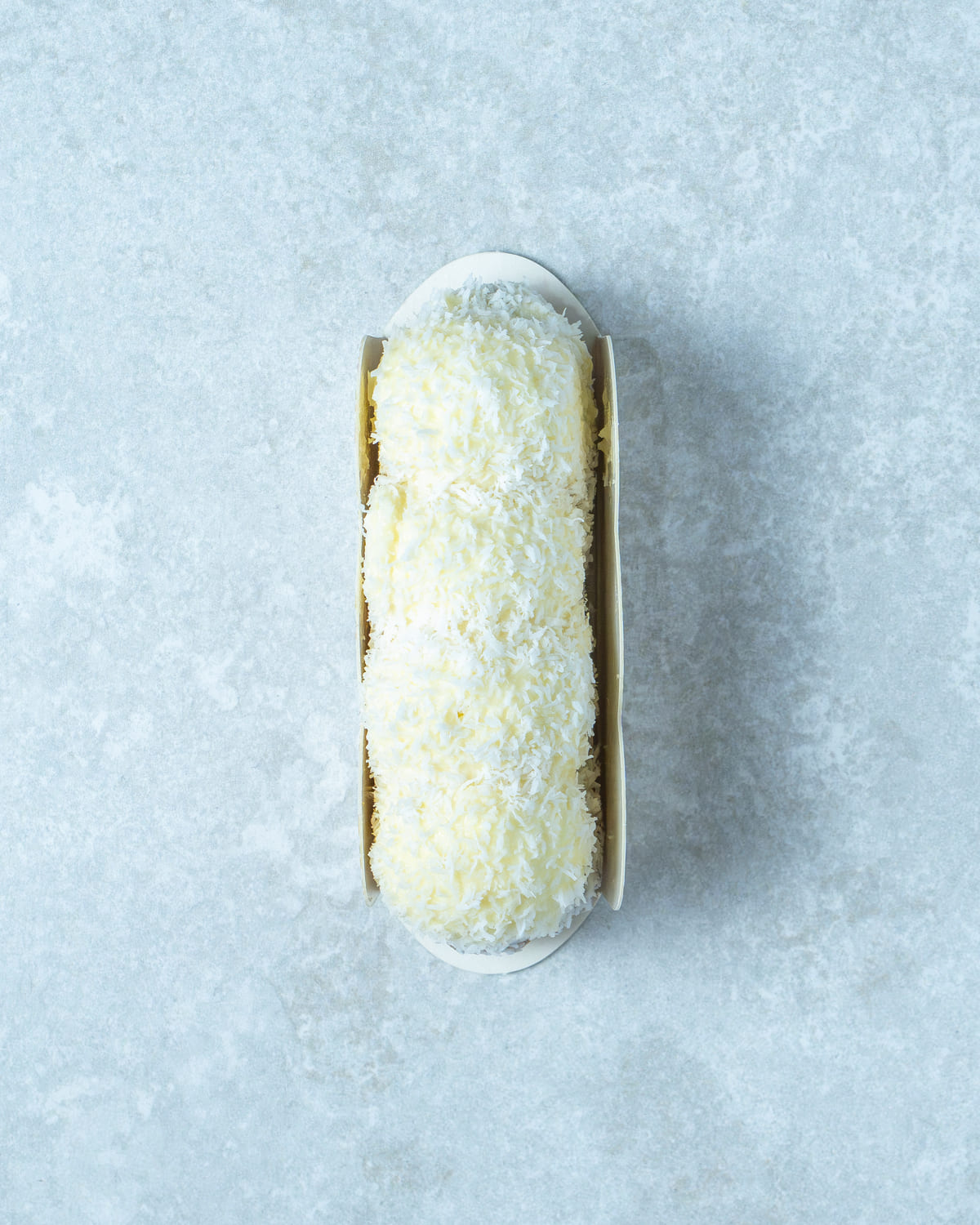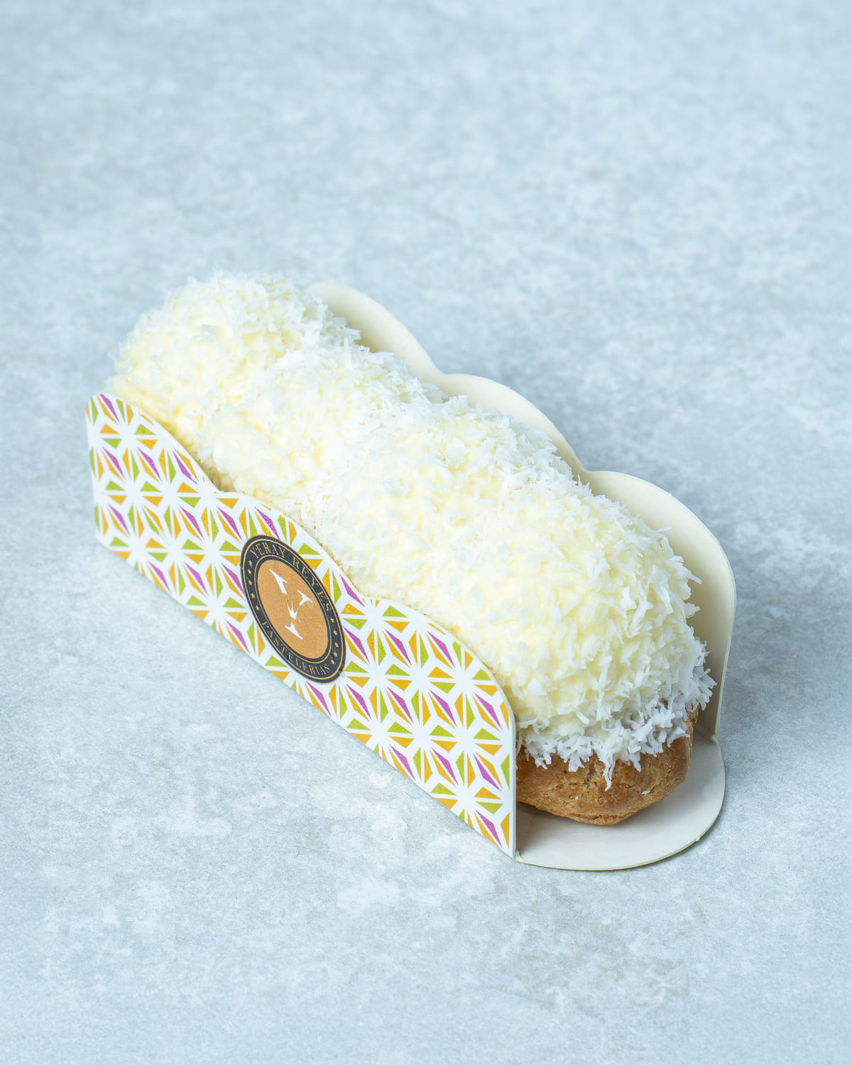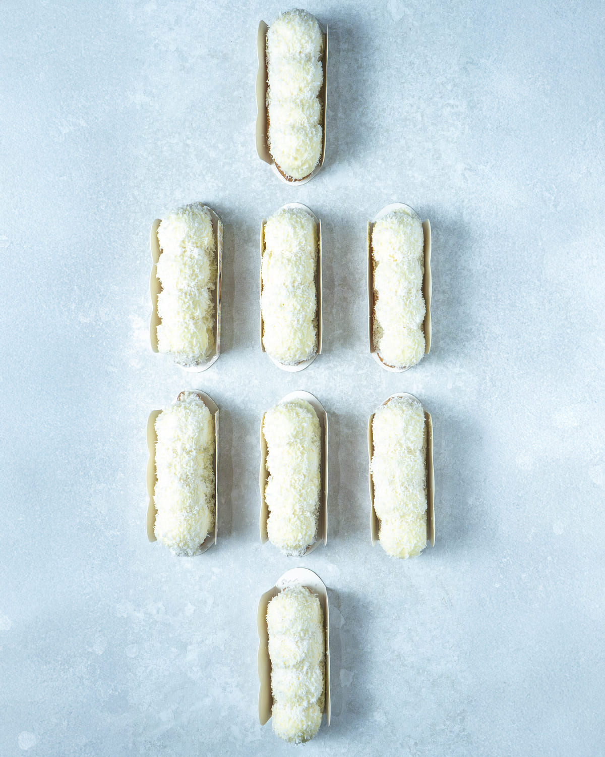 Eclair de Raffaello relleno de cremoso de coco, con crujiente de barquillo y cobertura de chocolate blanco.