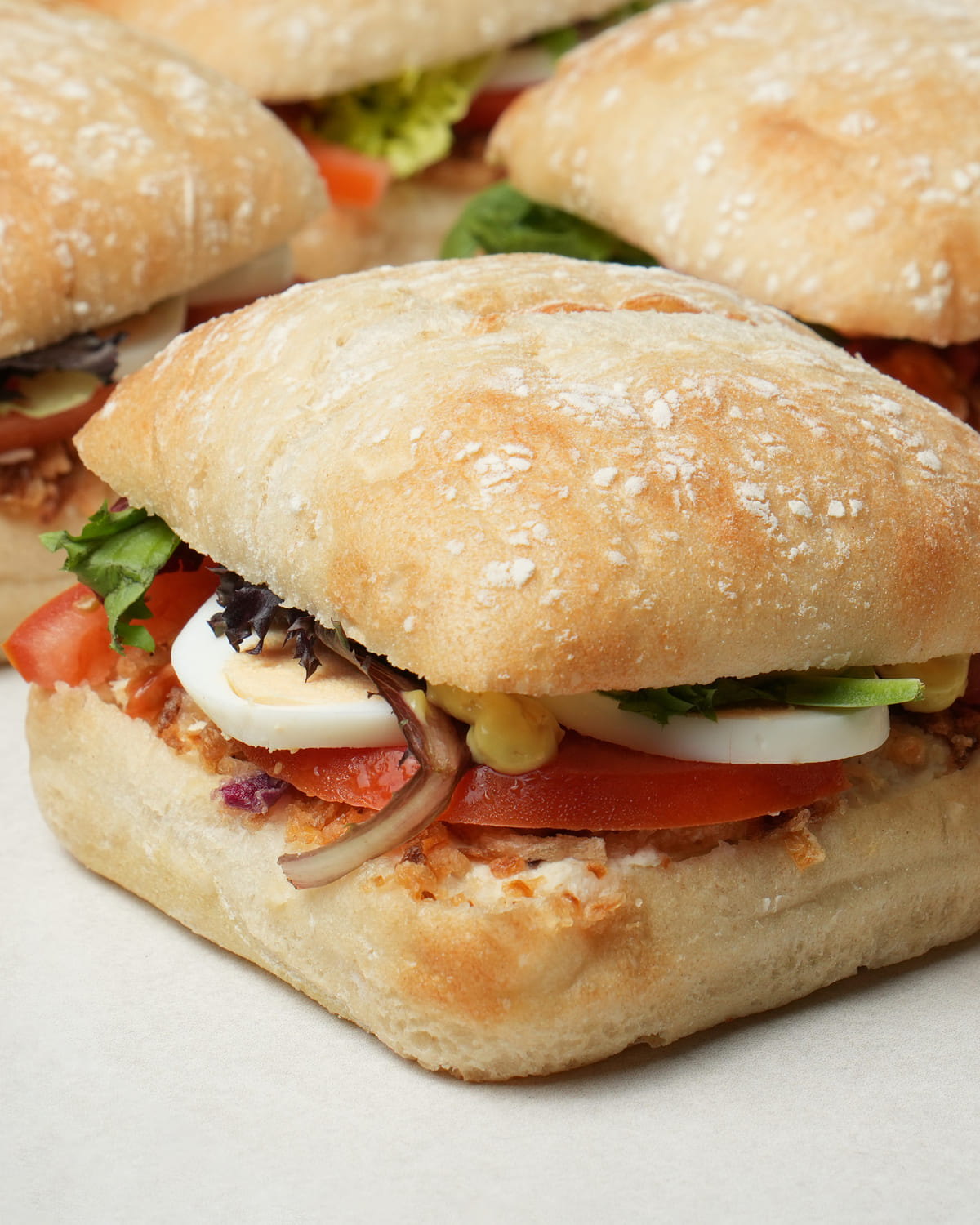 Crujiente pan de cristal relleno de jugosa masa de pollo con mayonesa, lechuga fresca, tomate, huevo cocido, cebolla frita y la clásica salsa remoulade.