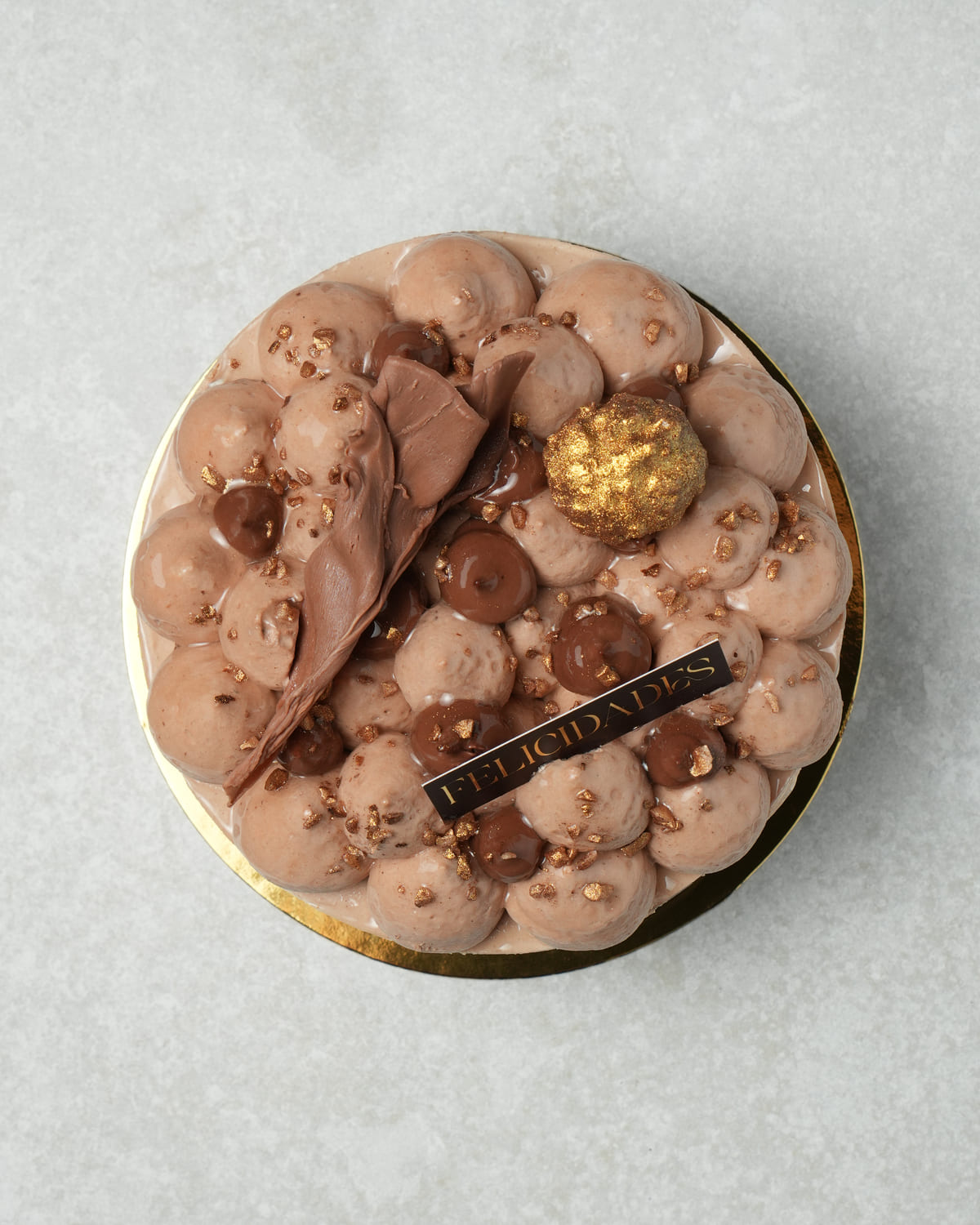 Bizcocho de chocolate, namelaka y crujiente de ferrero con mousse de chocolate y avellana mousse y crujiente de avellana.